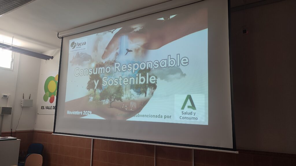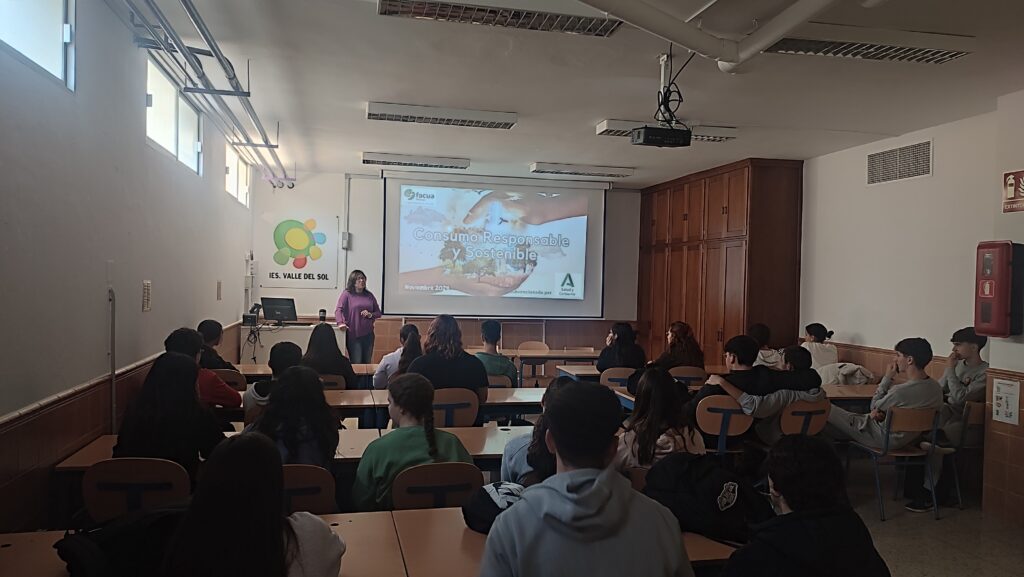 Esta semana hemos tenido el placer de contar con Lola García, representante de Facua-Consumidores en Acción o simplemente Facua, que es una organización no gubernamental española, dedicada desde 1981 a la defensa de los derechos de los consumidores. Durante dos días (11 y 12 de noviembre) el alumnado del IES Valle del Sol ha asistido a una breve formación sobre el Consumo Responsable para que se conviertan en consumidores responsables, conscientes y críticos con las prácticas más dañinas para nuestro planeta.
